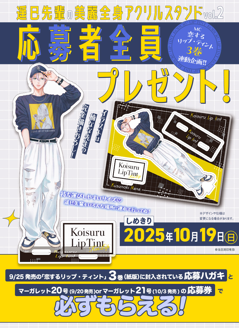 9月25日(木)発売の MC「恋するリップ・ティント」3巻(紙版)に封入されている応募ハガキにマーガレット20号(9/20発売)orマーガレット21号(10/3発売)の応募券を切り取って貼り、必要事項を明記の上、投函してください。