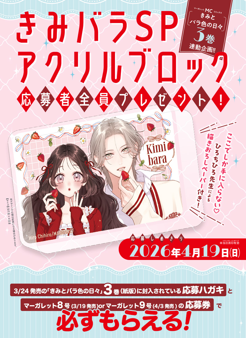 3/24発売のMC「きみとバラ色の日々」3巻(紙版)に封入されている応募ハガキにマーガレット8号(3/19発売)orマーガレット9号(4/3発売)の応募券を貼り、必要事項を明記の上、投函してください。