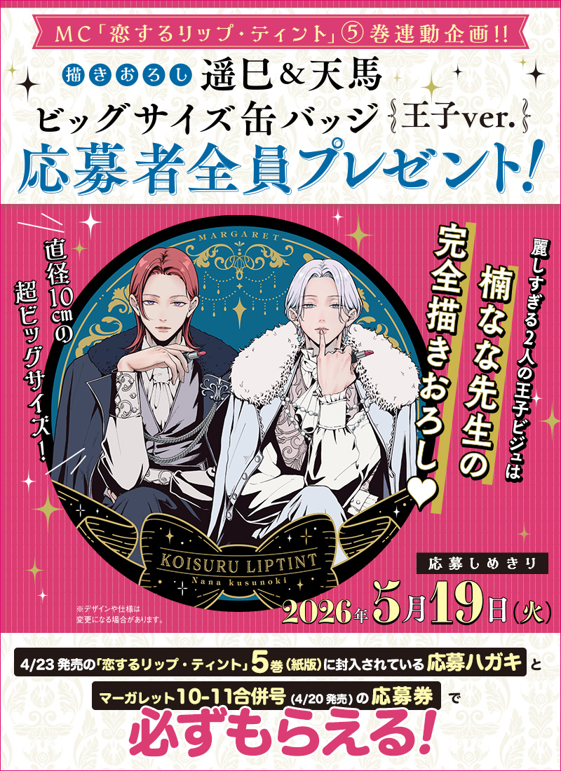 4月23日発売のMC「恋するリップ・ティント」5巻(紙版)に封入されている応募ハガキにマーガレット10-11合併号(4月20日発売)の応募券を貼り、必要事項を明記の上、投函してください。